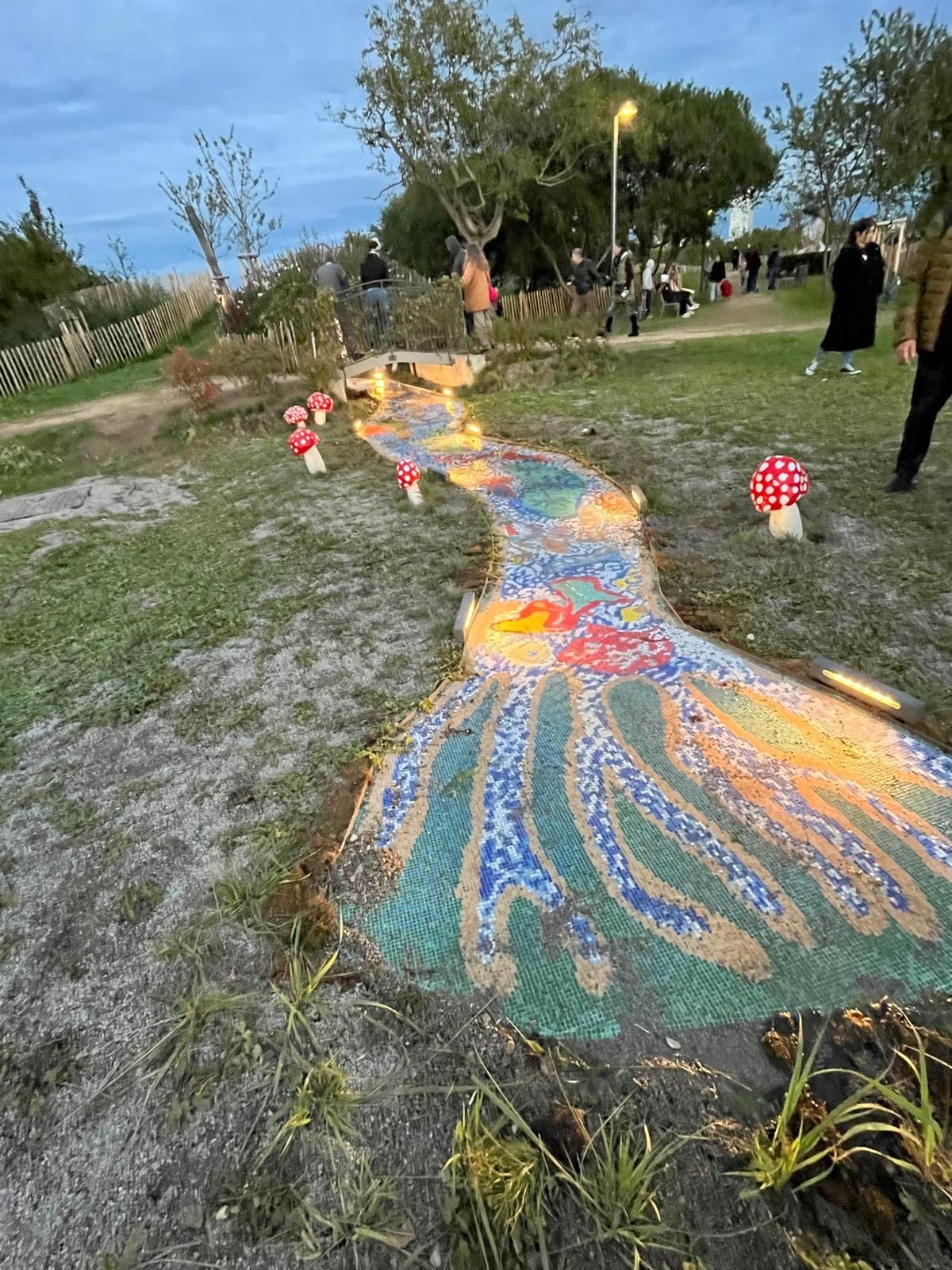 Mich hat diese Mosaik mehr interessiert. Es sind 3 Wandmosaike die von der Fürther Mosaik Künstlerin Iris Rauh gestalten worden sind. Sie sind in der Technik des Scherbenmosaik gestaltet.